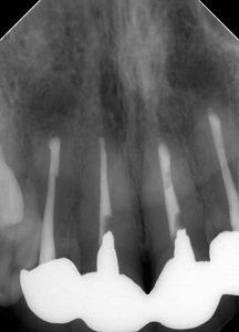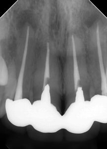 主訴は「前歯の根本の歯ぐきが痛い。10年くらい前に自費治療で被せ物をした。その時は神経が生きていたが、被せ物をするために神経を取った。治療するのに被せ物を取らないといけないのか相談したい。」